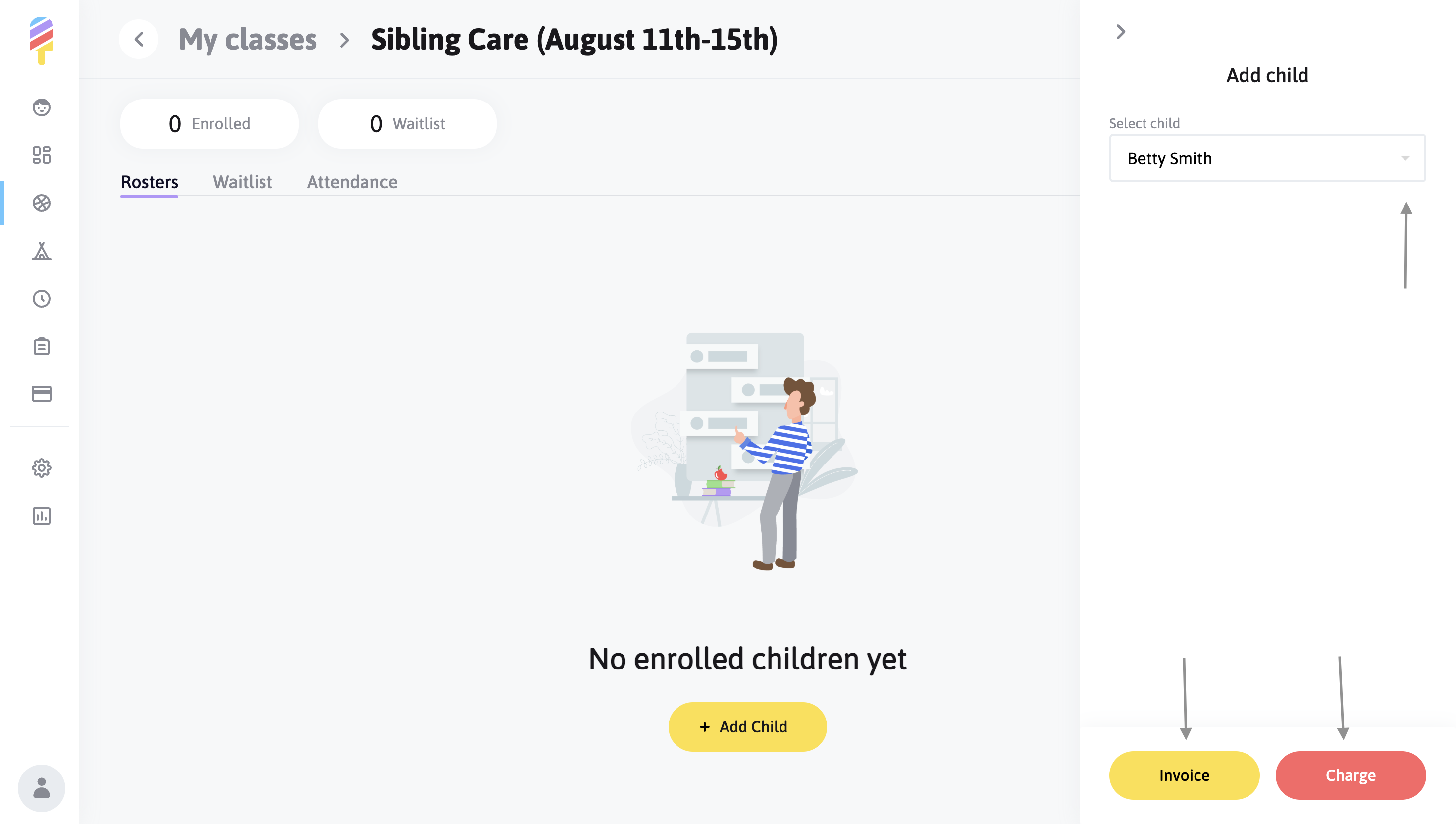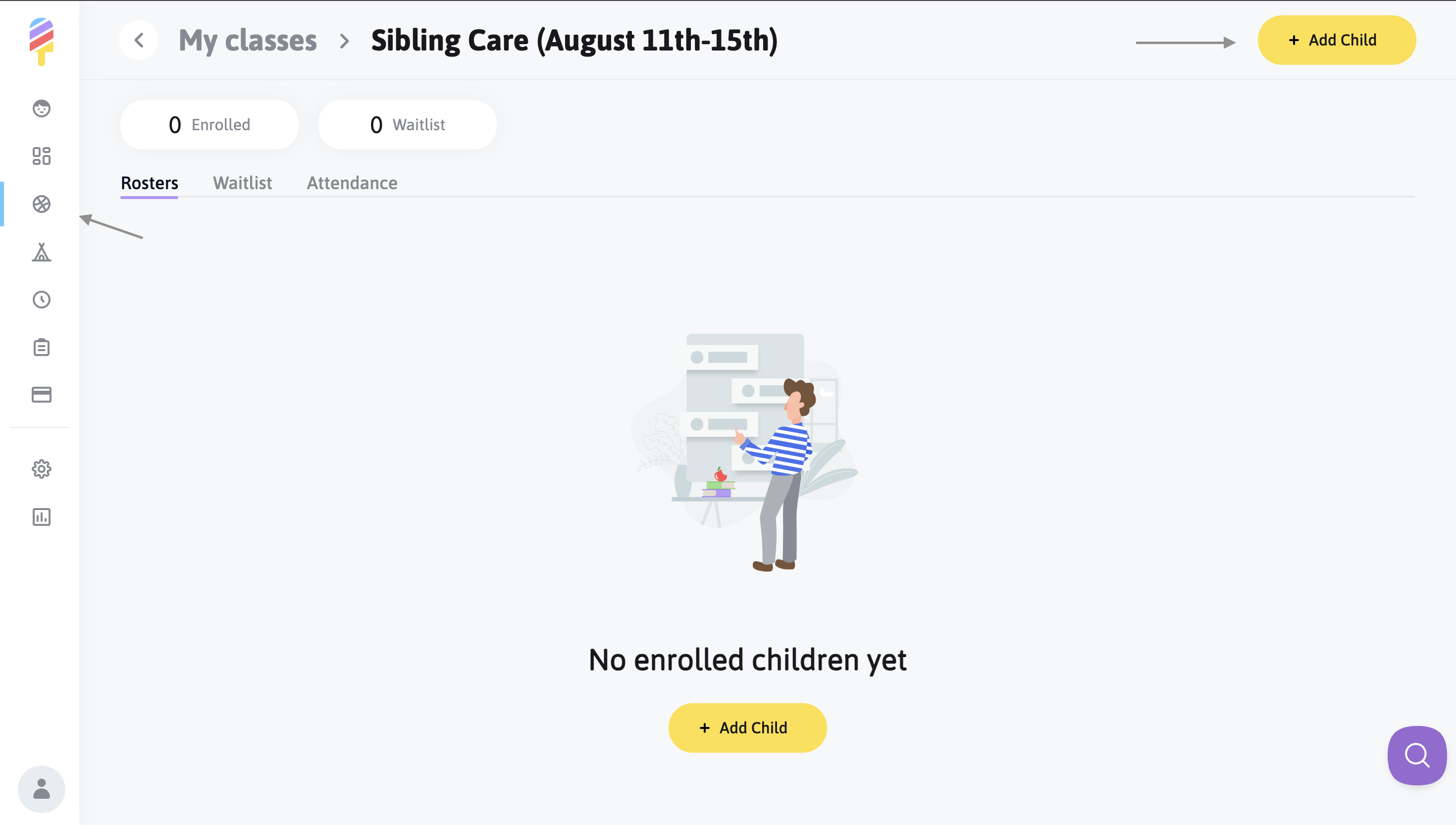 To add a child to a roster manually, click on the classes icon at the left side of the screen, and then click on the class in question. Once you see the roster for the class, choose the "add child" option in the upper righthand corner of the screen: