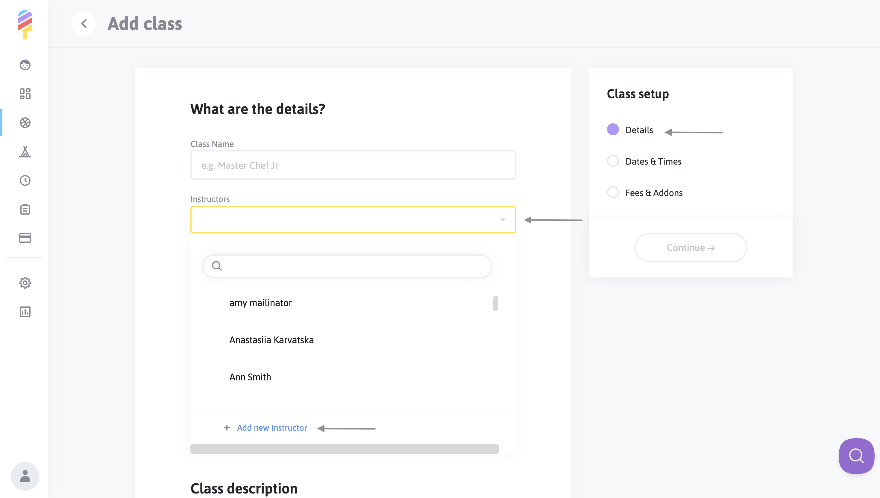 You will be taken to a screen where you can name your class, choose a location, and you'll see an "Instructors" field as well. When you click on the "Instructors" box, a drop down menu will appear, with the names of existing instructors, as well as the option to "Add new Instructor." Choose to "add a new instructor," if the one you need isn't available in the drop down menu.