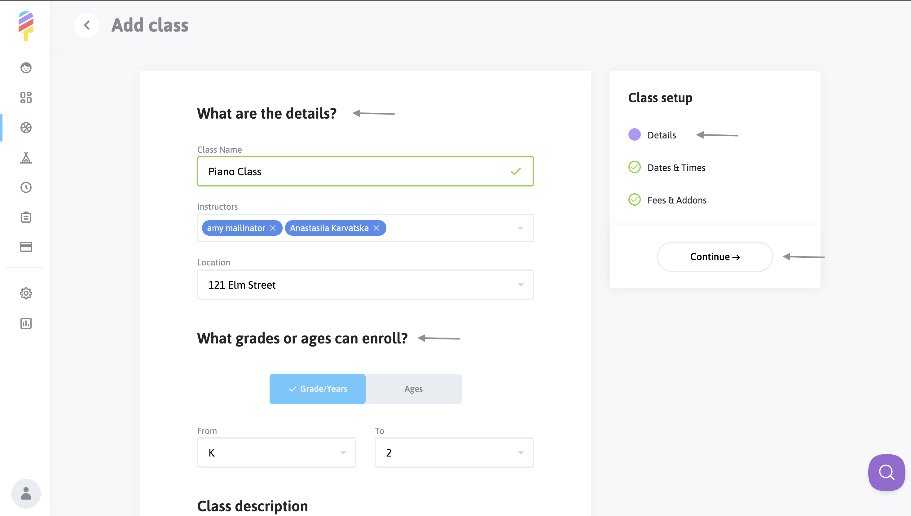 Once you've clicked on "Add Class" what's the next step? You'll then be prompted to fill out a dialog box with the details of your class. Here, you can see the class set up by grade level or by age. Once all the fields are filled out, click the "Continue" button-