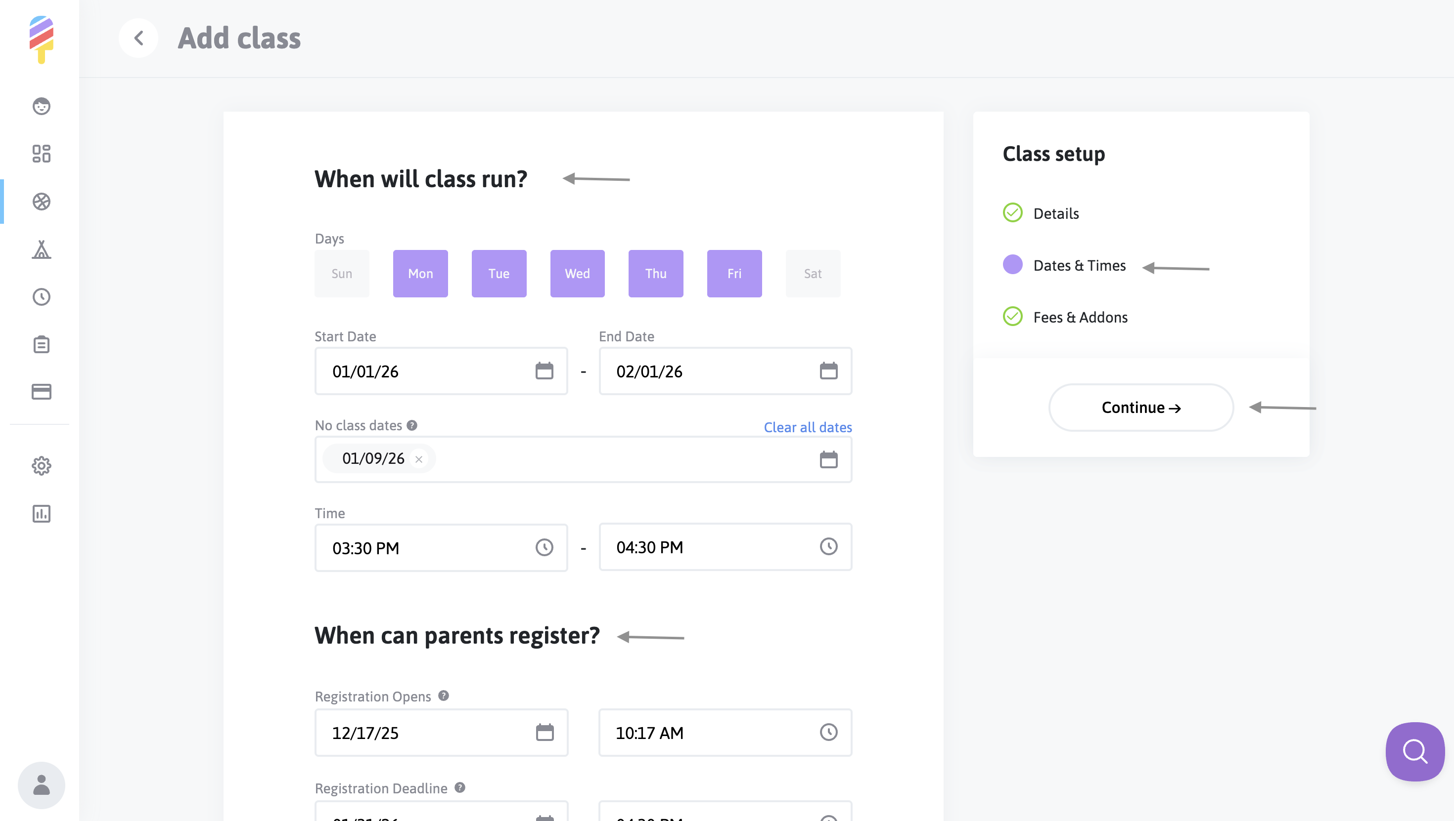 Then, you'll need to fill out the dates and times for your class, and click on the continue button when all fields are complete: