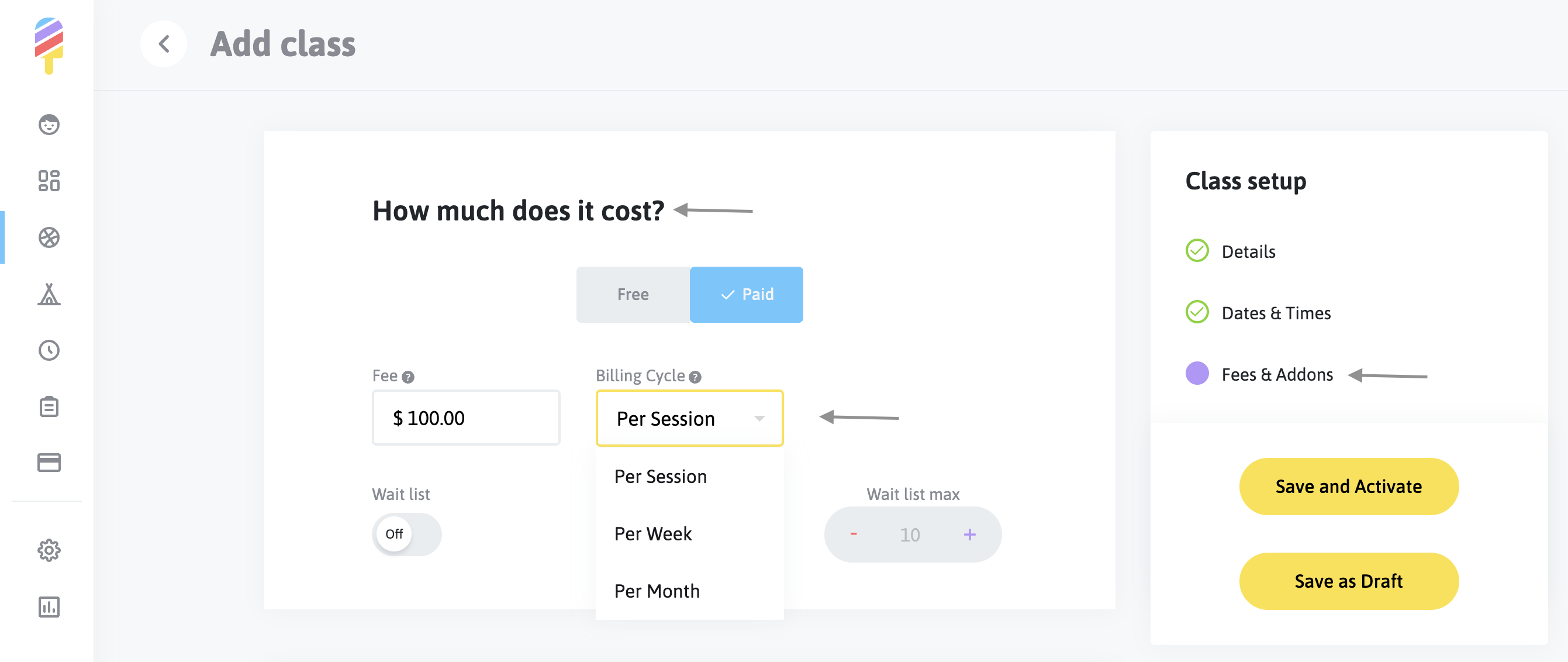 If your class will have a fee, you will designate that here, and choose whether the amount is charged to the parent per week, per month, or just once, for the entire session.