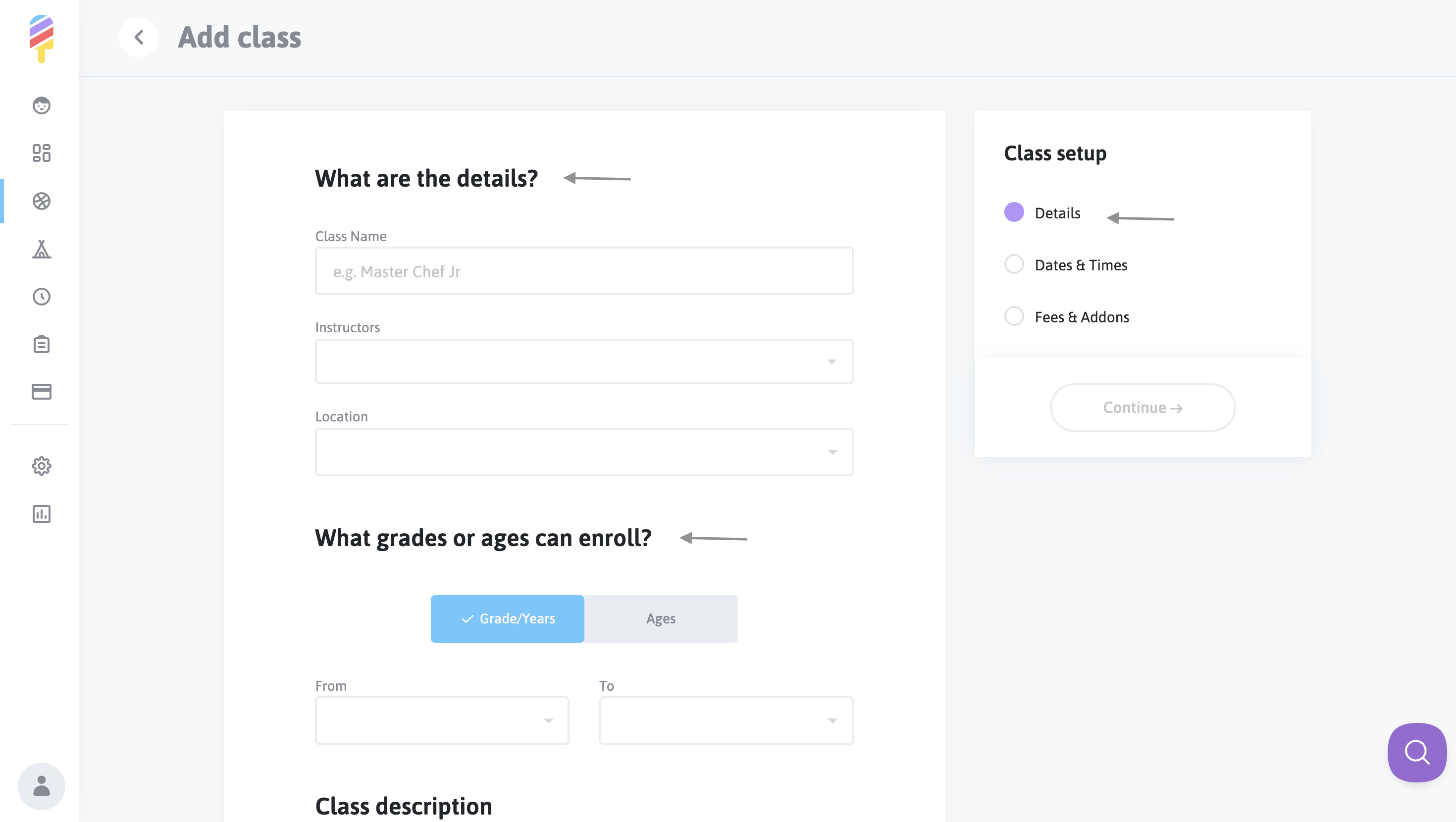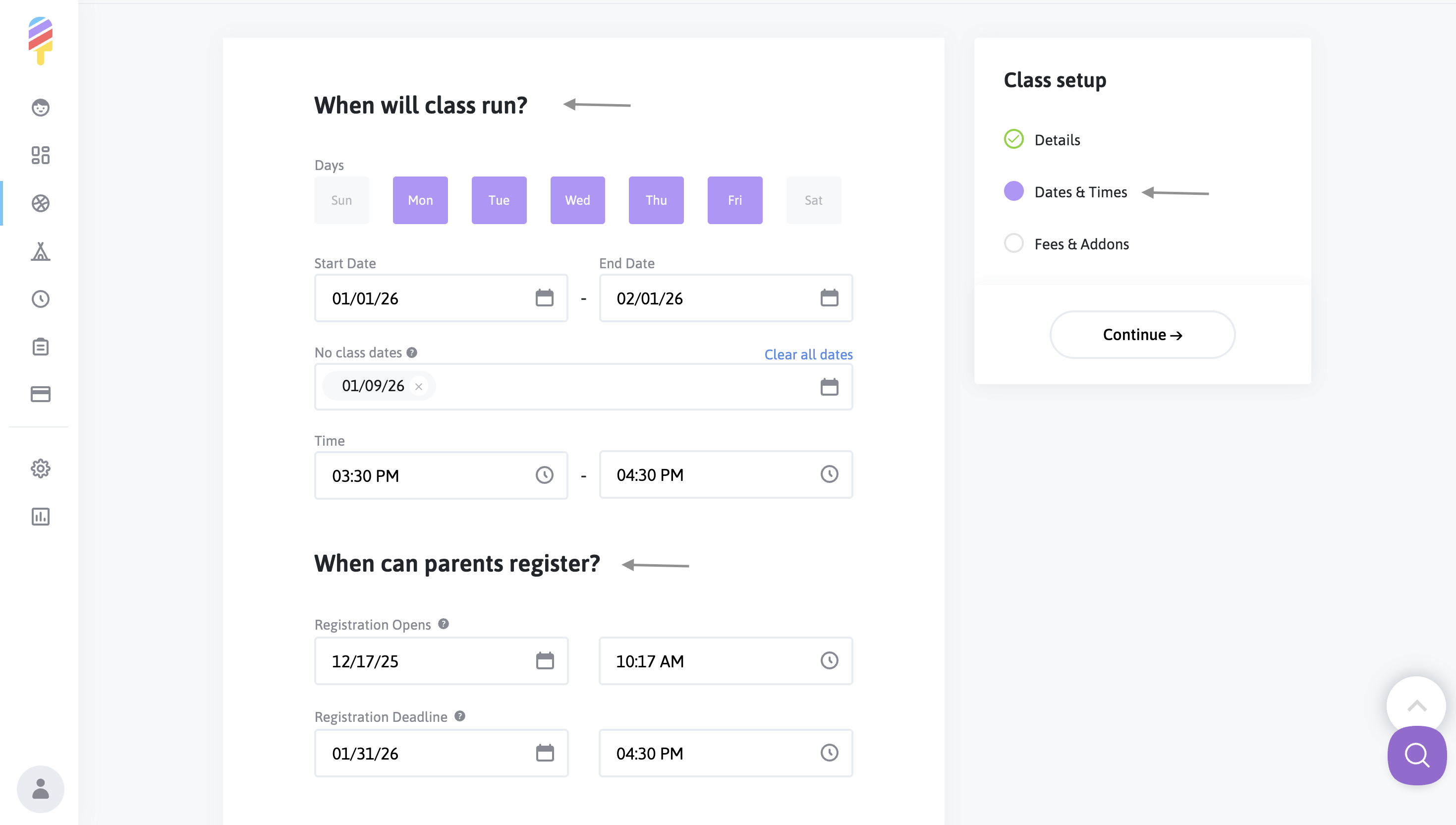 Once you've entered your class details, you will move to the next section to designate your Dates & Times, as well as any dates that there won't be class (No class/session dates) :