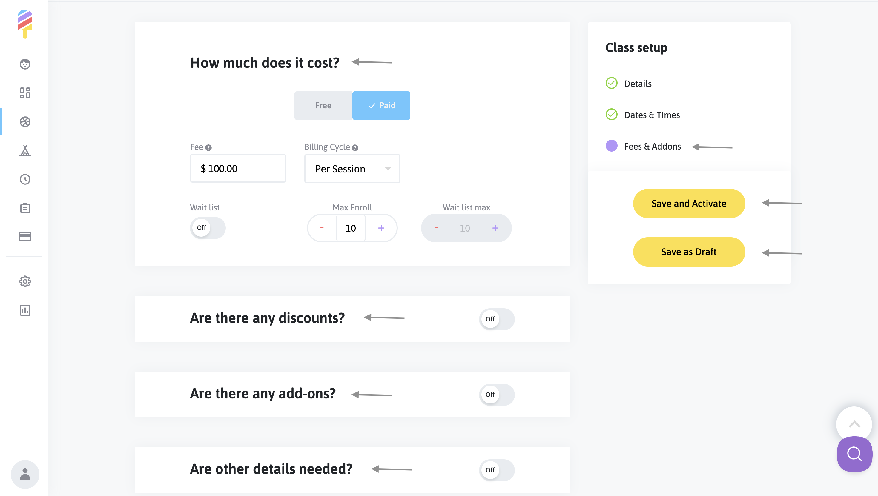 After you've entered the information regarding dates and times, the final section will allow you to set the cost of your activity, manage your capacity, and determine whether your class needs any additional Fees & Add-Ons. After you've completed this page, simply click "Save and Done."
