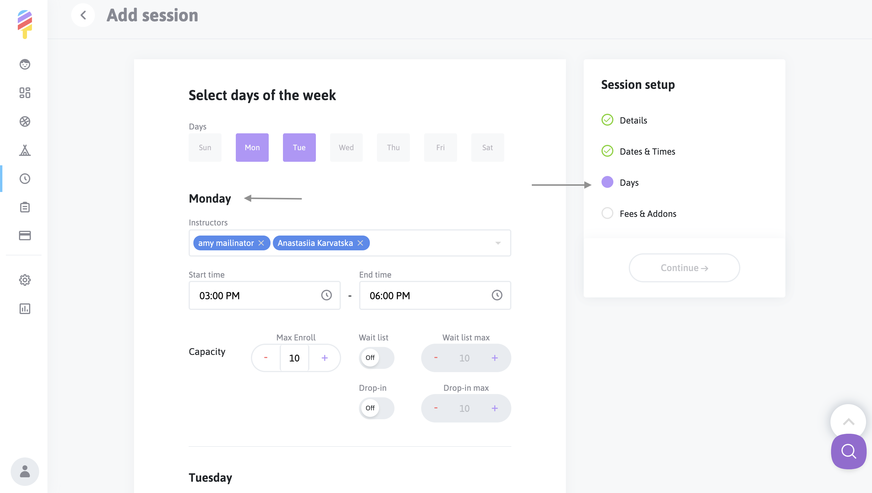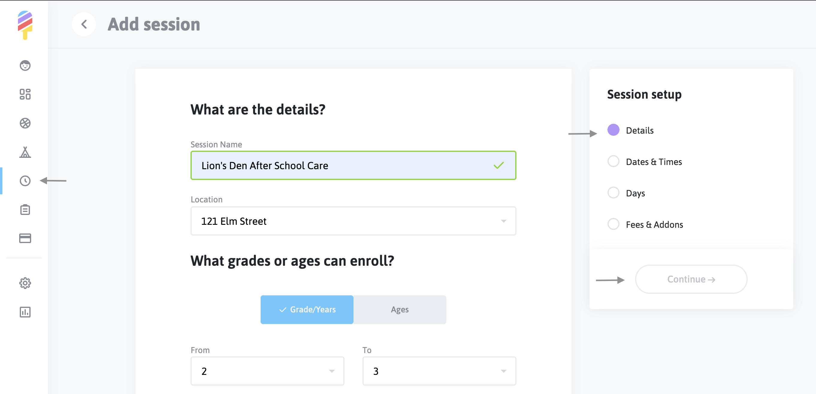 When starting to build your aftercare session, you will fill in the details of the session just as you would for Classes or Camps, and then once all the fields are filled, click the Continue button, here: