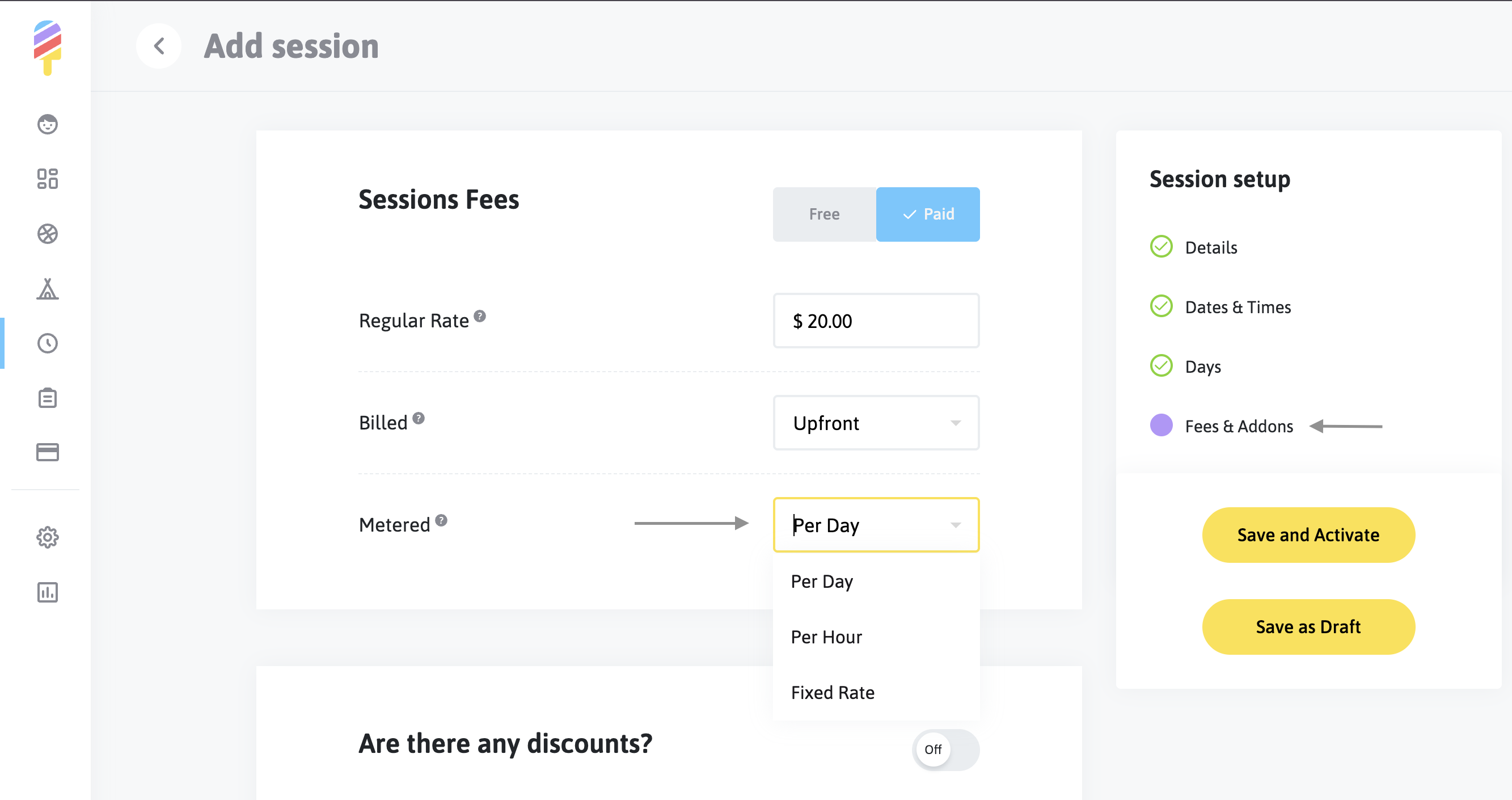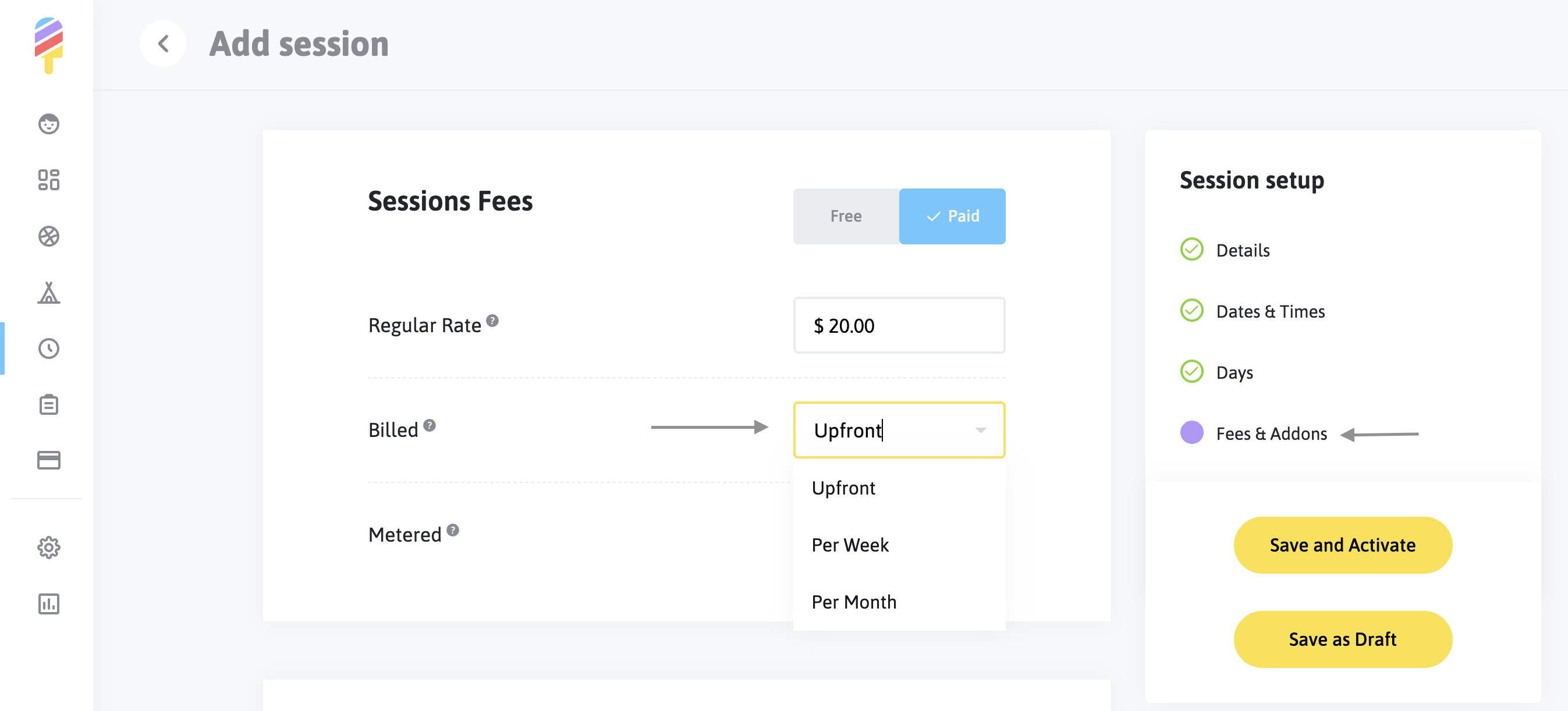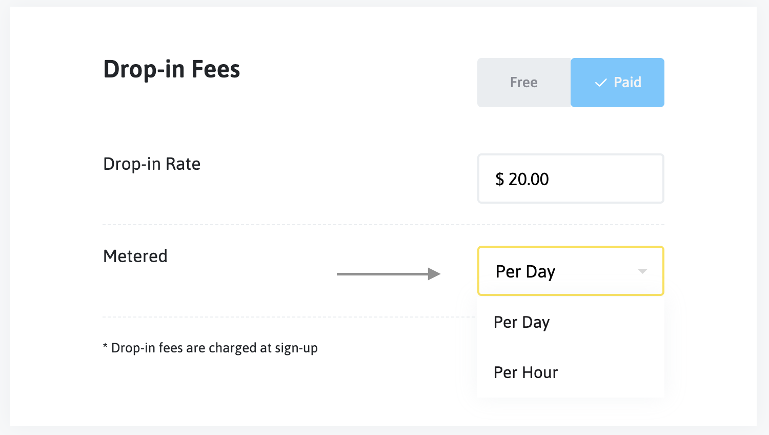Once you've decided on your Session Fees, you will need to set up your Drop-In billing. You can charge the same amount as your other pricing options, or you can charge a different rate for Drop In's. You can choose the rate for the Drop-In to be charged either by the day or the hour, but this fee must be paid up front when registering: