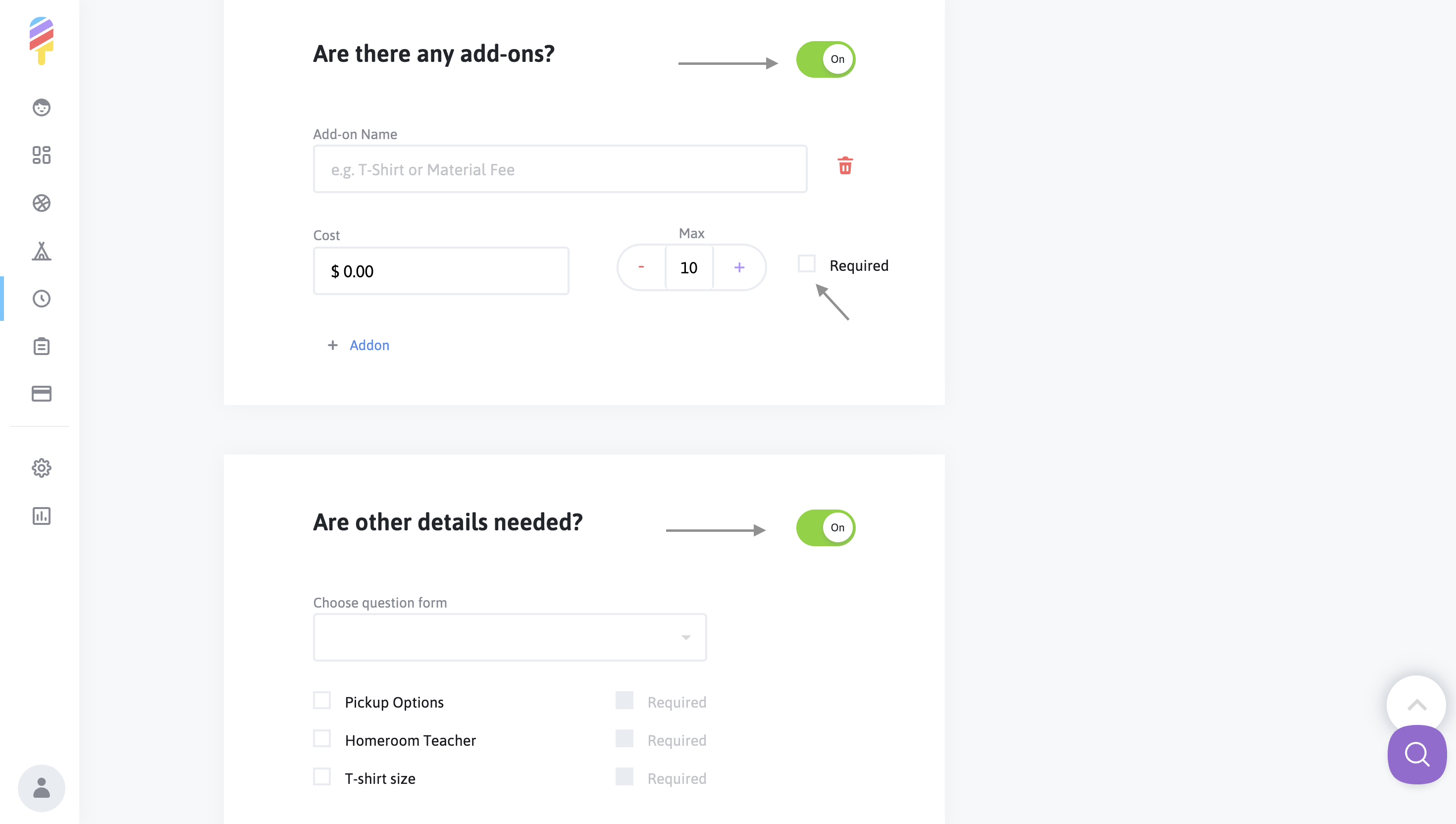 Lastly, you will be able to configure any Add-On's, such as Material Fees, Lunch/Snack offerings, T-Shirts, etc., and set prices for those--as well as designating if they are a required purchase. You will also see the option at the bottom of the section to require parents to provide Pickup details, the child's Homeroom teacher, and T-Shirt size, if applicable--and require that information before being able to successfully register. These can also be toggled off, if not in use: