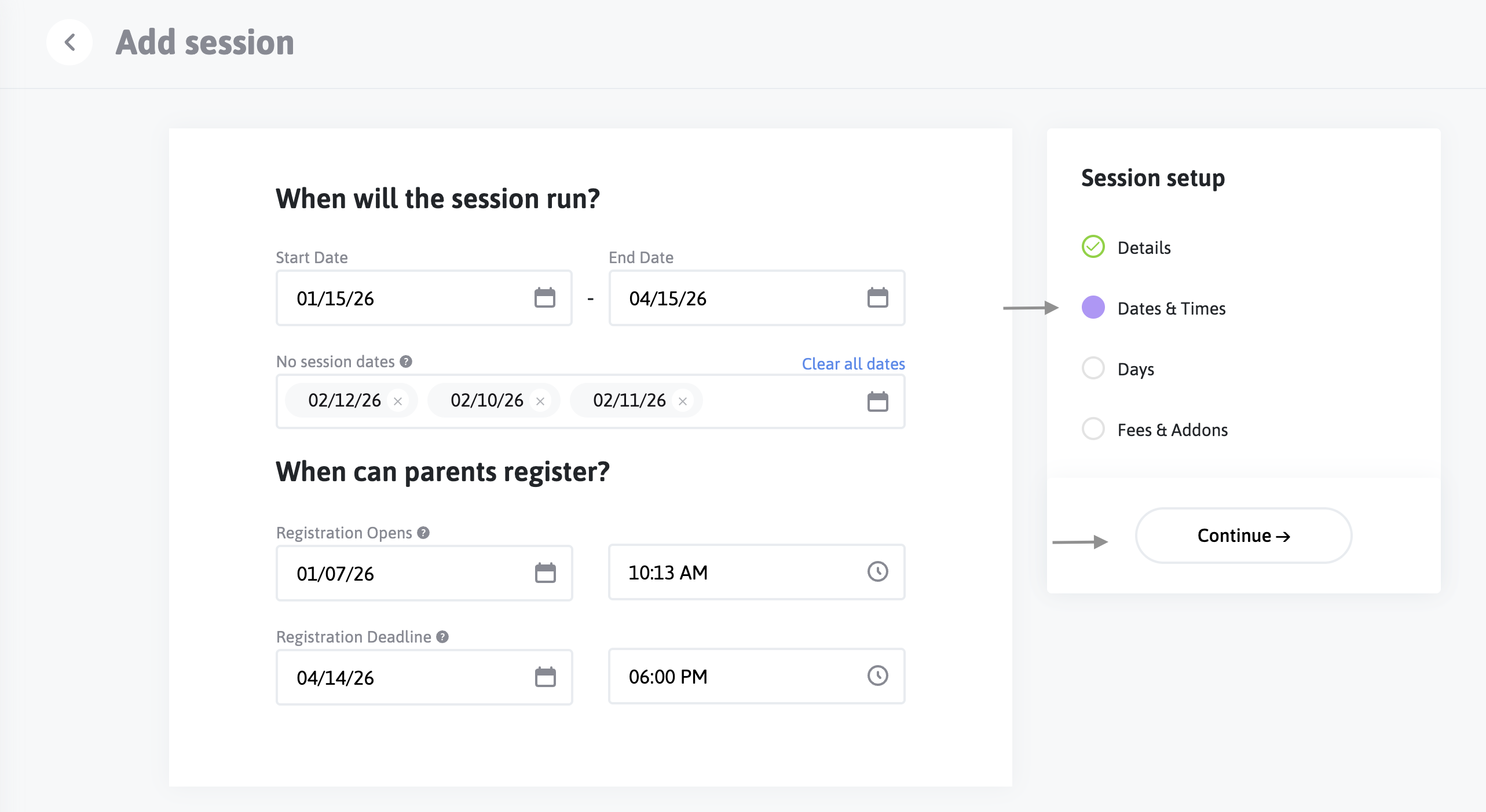 Next, you'll move on to the Dates & Times section of the session setup process. Here, you'll designate the start and end dates for the session, the "No Session Dates" (any days during that time period where there will be no aftercare,) and the registration window dates and times. Once all fields are filled, just click the Continue button: