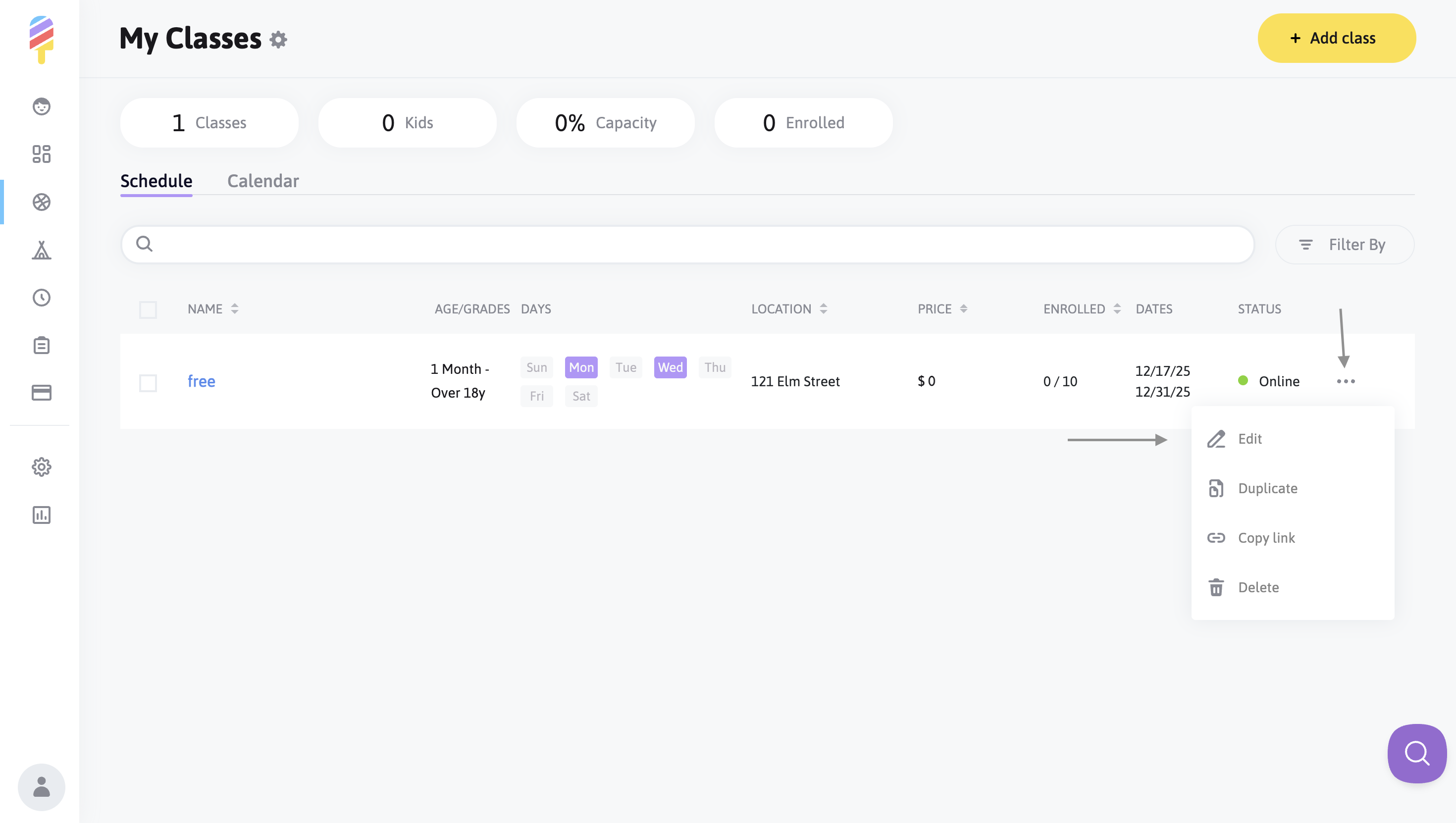 Need to make an adjustment to one of the activities on your schedule? No problem! Making edits is extremely quick and easy. First, while logged into your Popsicle account, click on the Classes, Camps, or Aftercare icon from the menu along the left side of the screen. Then, look for the activity you need to edit, click on the three dots to the far right of that class, and choose Edit: