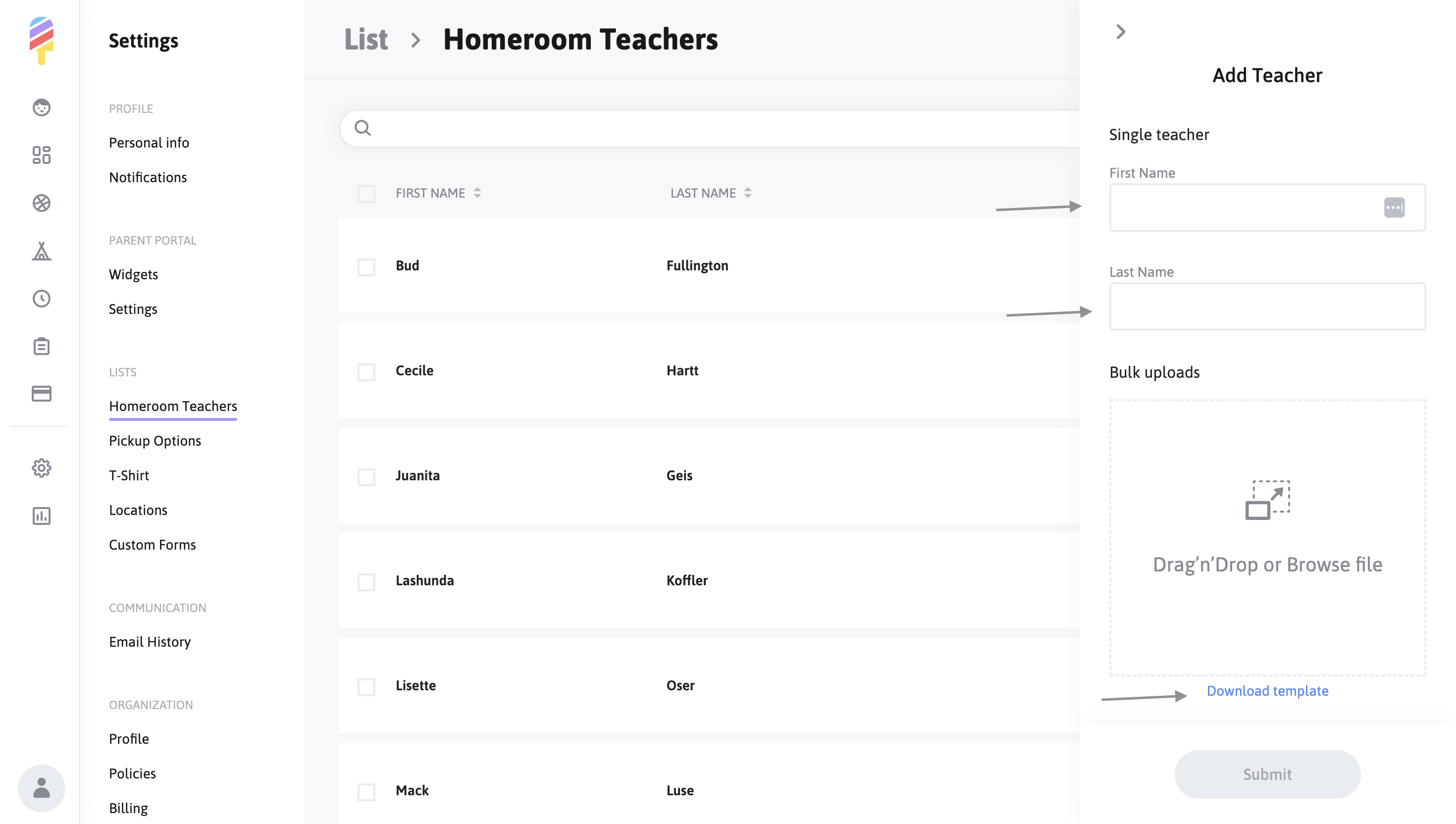 If you have a list of multiple additions you need to make, you can use the bulk upload option, which will be visible after clicking on "Add Homeroom Teacher."