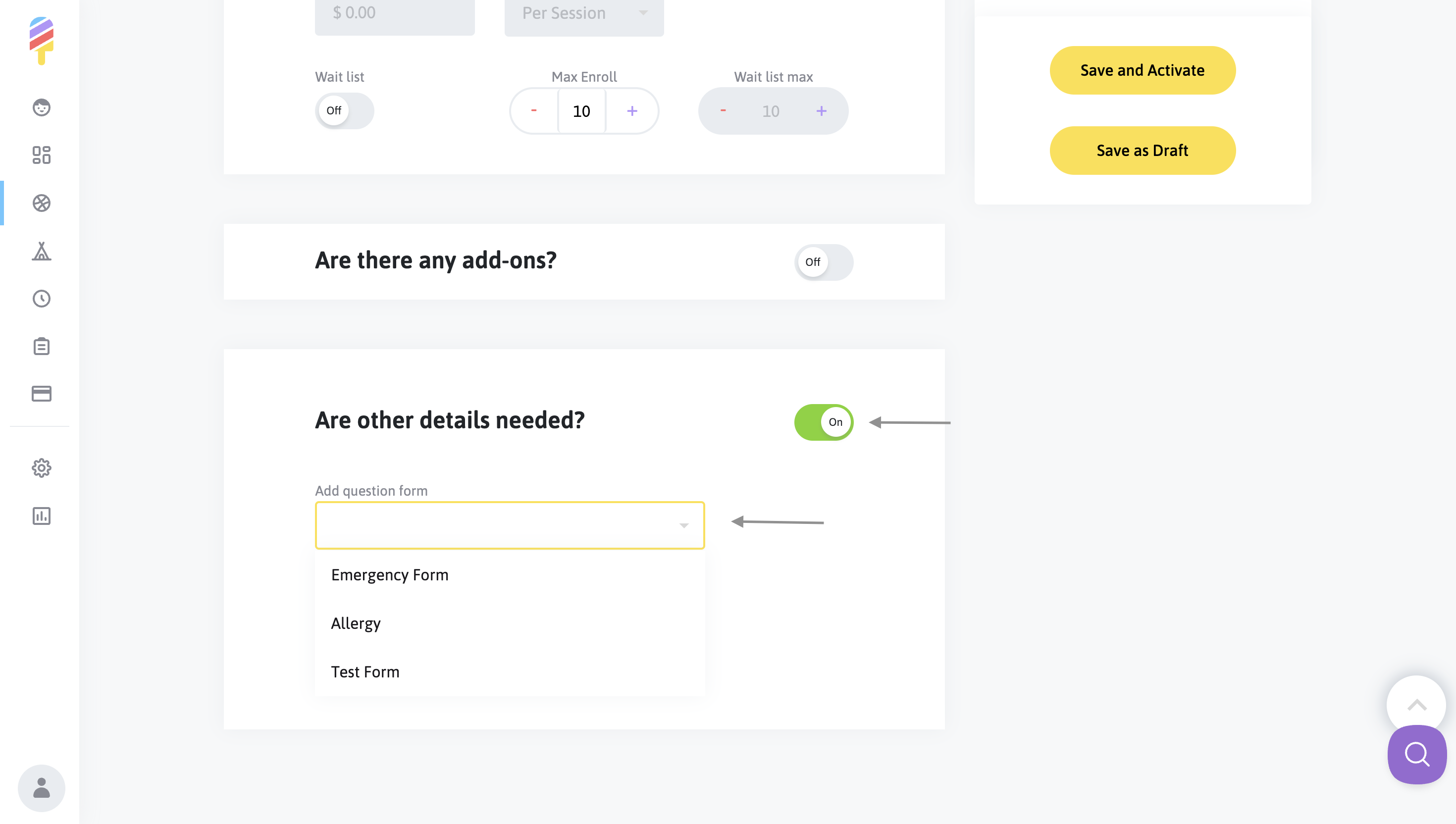 Once this option is toggled to the "on" position, you will be able to choose the applicable form that you would like families to see upon registration for that specific activity: