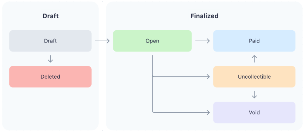 While in this status, any part of the Invoice can be edited, and the draft can be deleted unless the Invoice is created by a Subscription. Only draft Invoices can be deleted, and deleted drafts cannot be recovered. When the Invoice is ready to be used, it can be finalized; a draft Invoice cannot be paid.