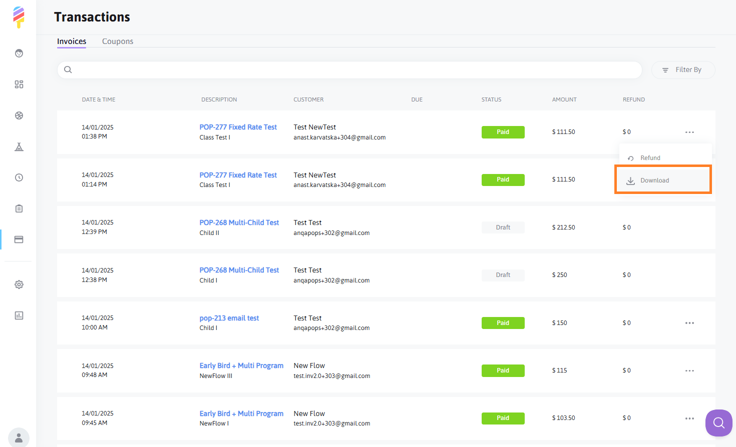 - Once the invoice is marked as 'Paid', the refund feature becomes available for the invoice, allowing the admin to initiate a refund if needed.