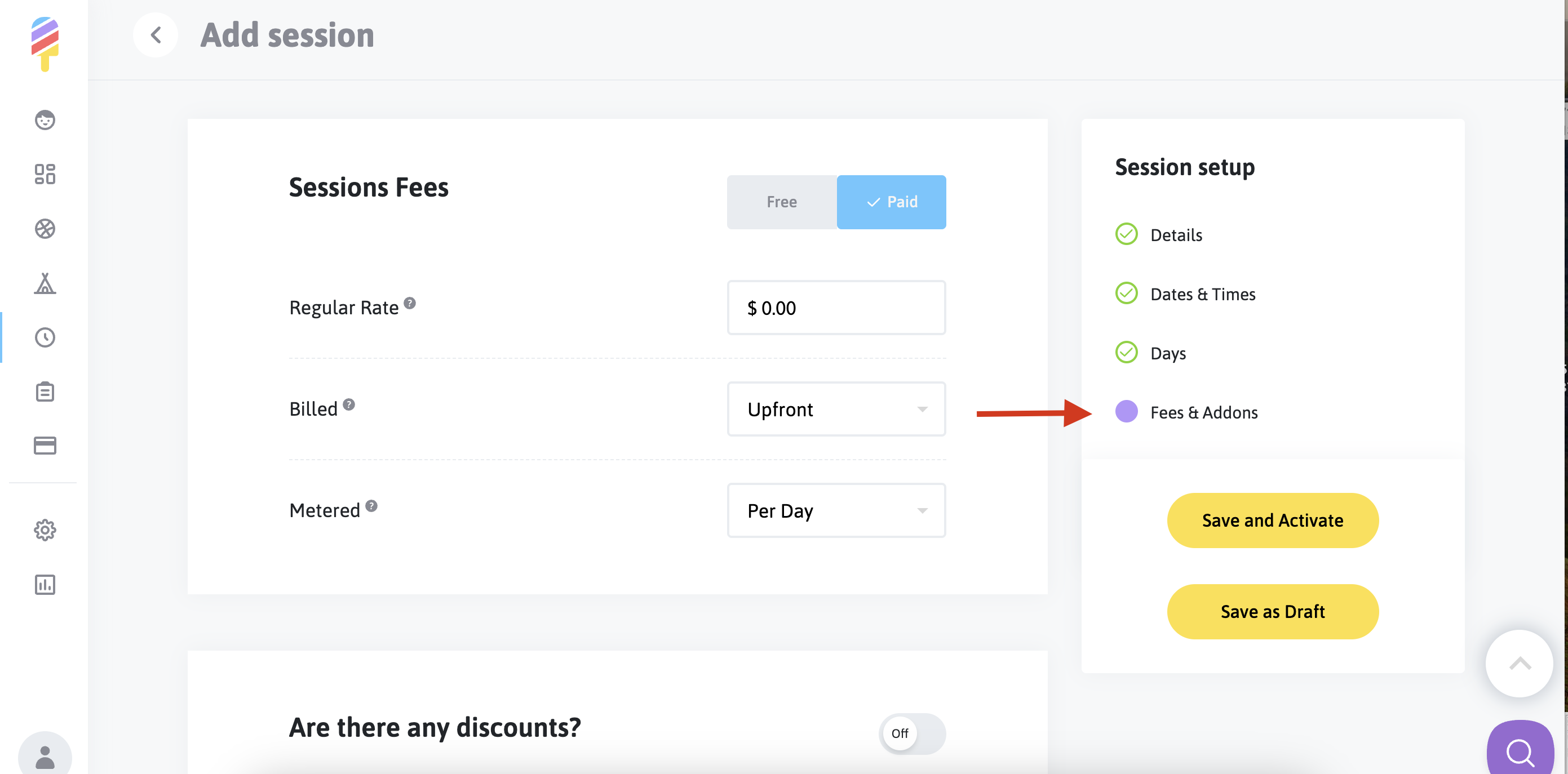 When you're creating an activity, the "Fees & Add-Ons" section is where you will set your discount preferences: