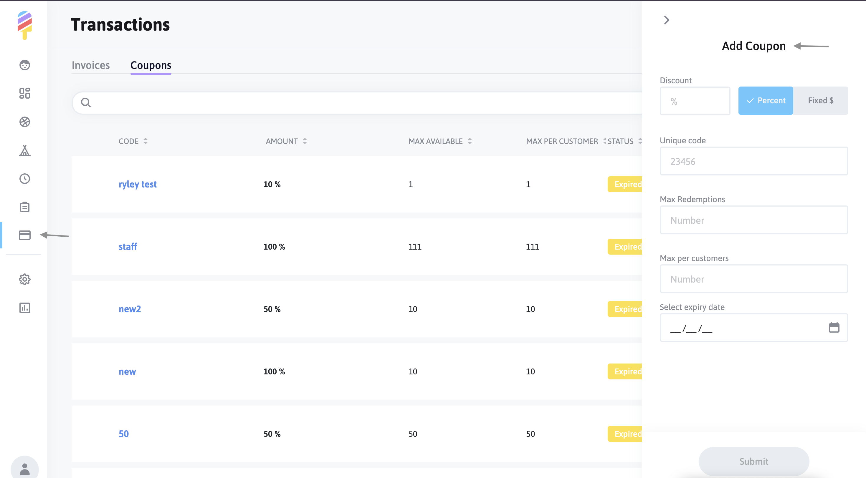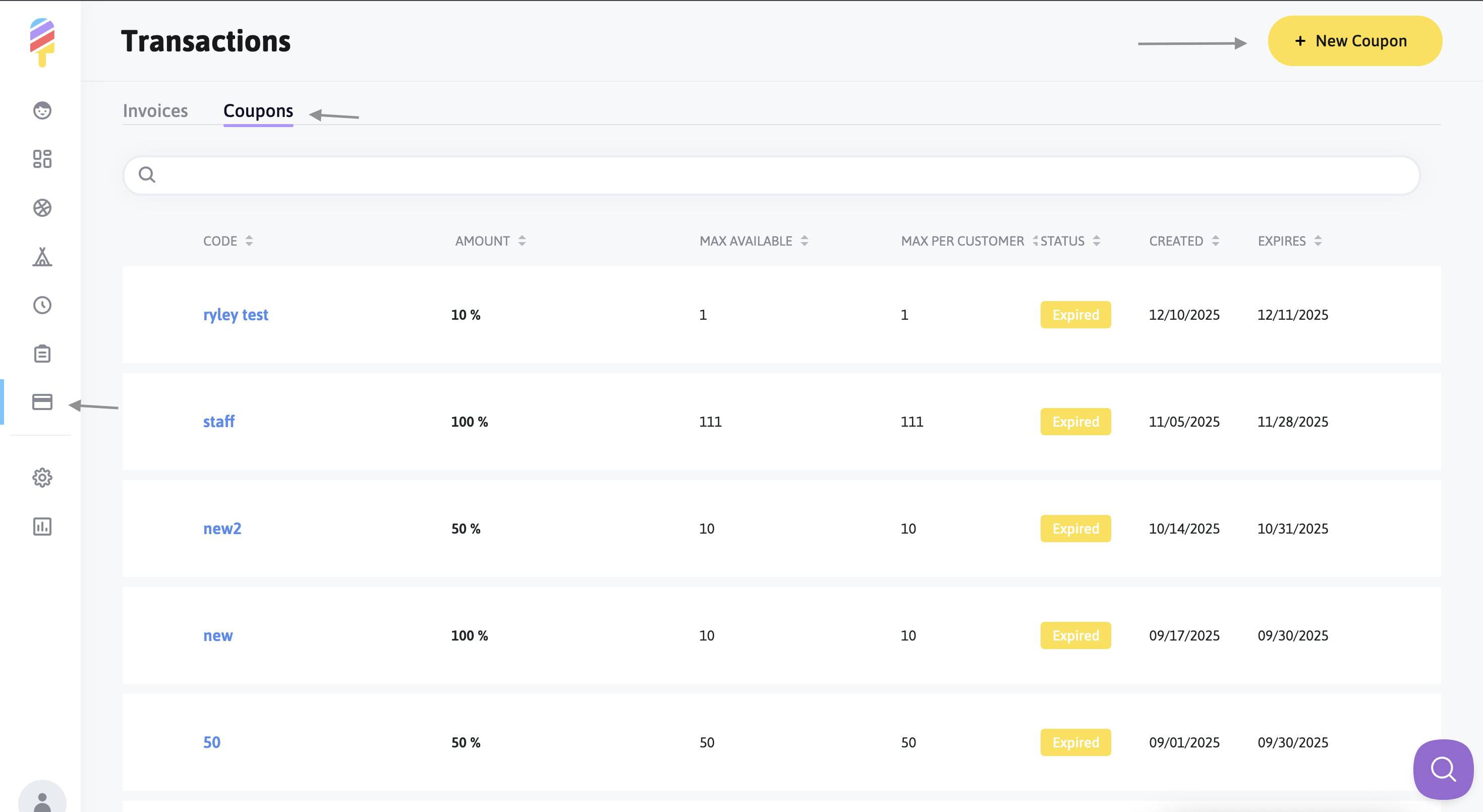 Creating new coupons in Popsicle is a breeze! First, click on the "Transactions" icon in the menu along the left side of your screen. From there, you'll click on the "Coupons" tab, and finally, click on the "New Coupon" option here: