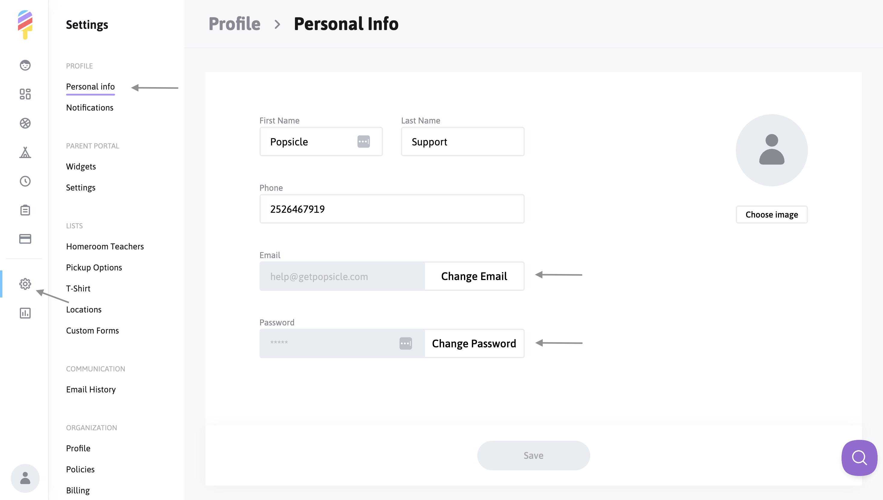 To start, you'll click on the "Gear Wheel Icon" along the menu on the left side of your screen to enter the Settings. Then, you'll click on "Personal Info" under the Profile subheading, and will see the options there to change one of, or both your email and your password: