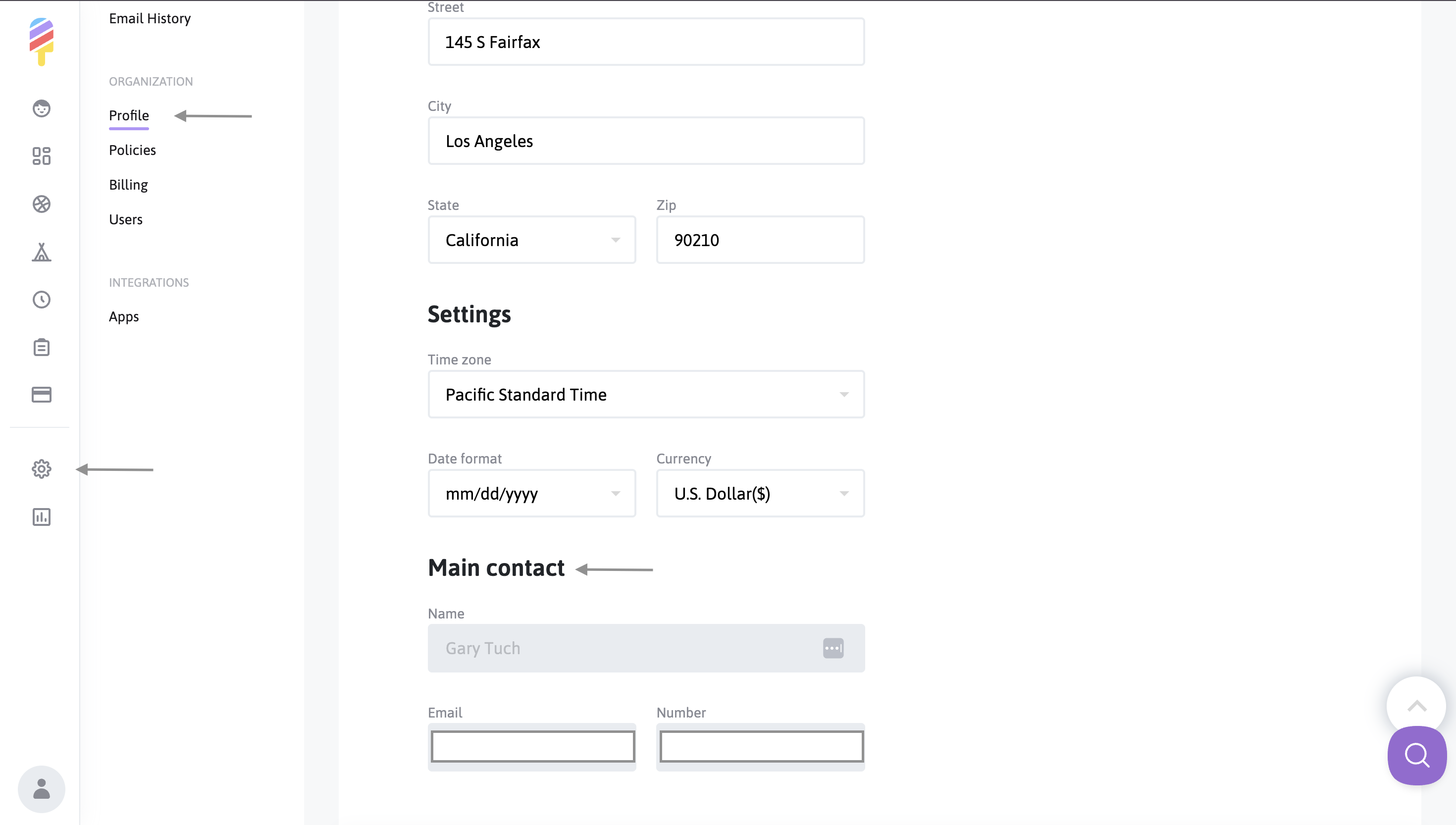 To view the current Main Contact for your account, you will need to click on the "gear" icon from the menu along the left side of your page to view your Settings. There, under the "Organization" subheading, you'll click on Profile, and scroll down to the bottom of the page. Your Main Contact information will be listed there: