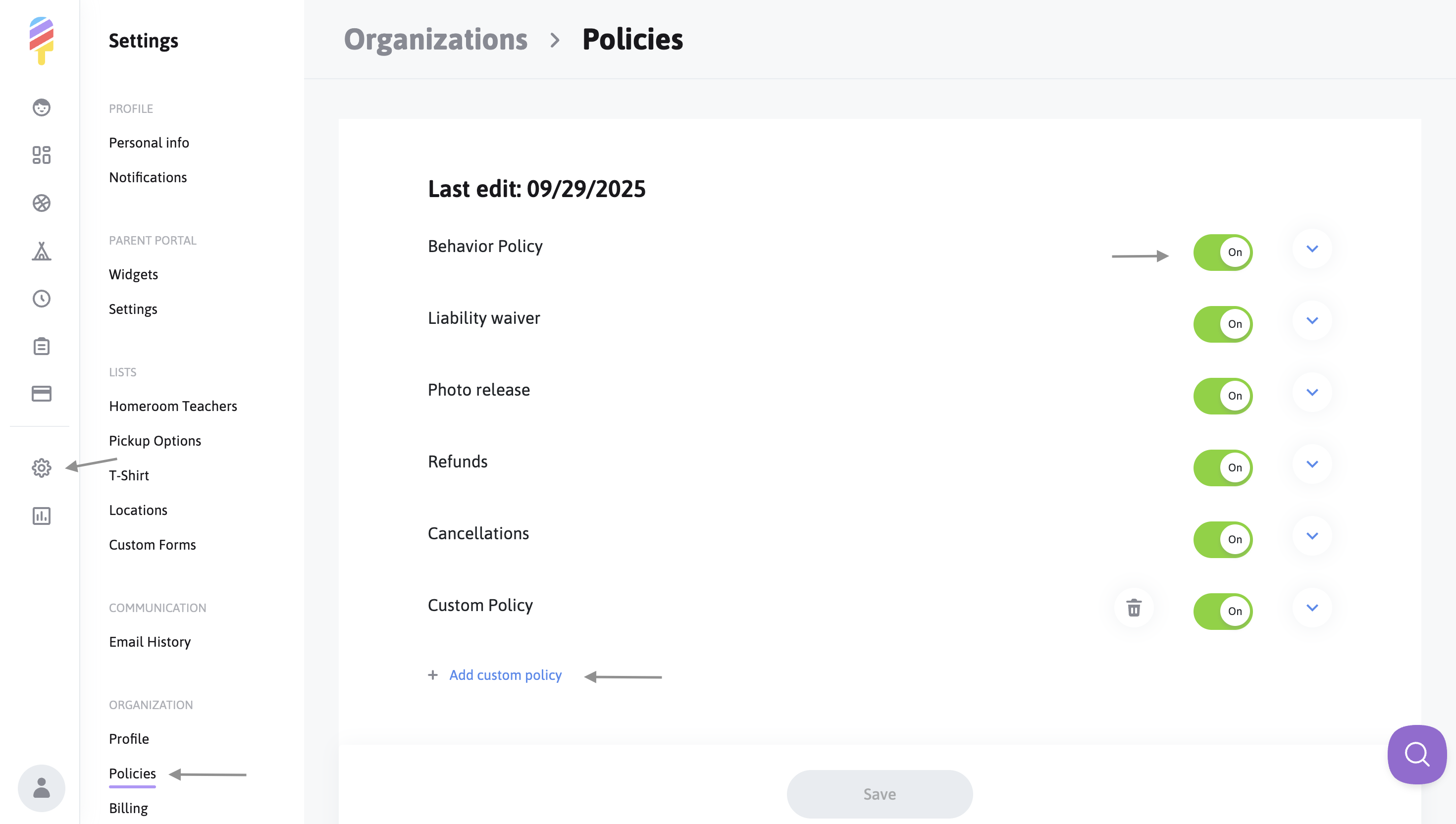 When logged into your account, click on the Gear Wheel Icon located along the left side of the screen to access the Settings. Then, under the Organization subheading, you will see the option to choose Policies. Click on the arrow there and you'll have access to add, edit, or delete program policies.