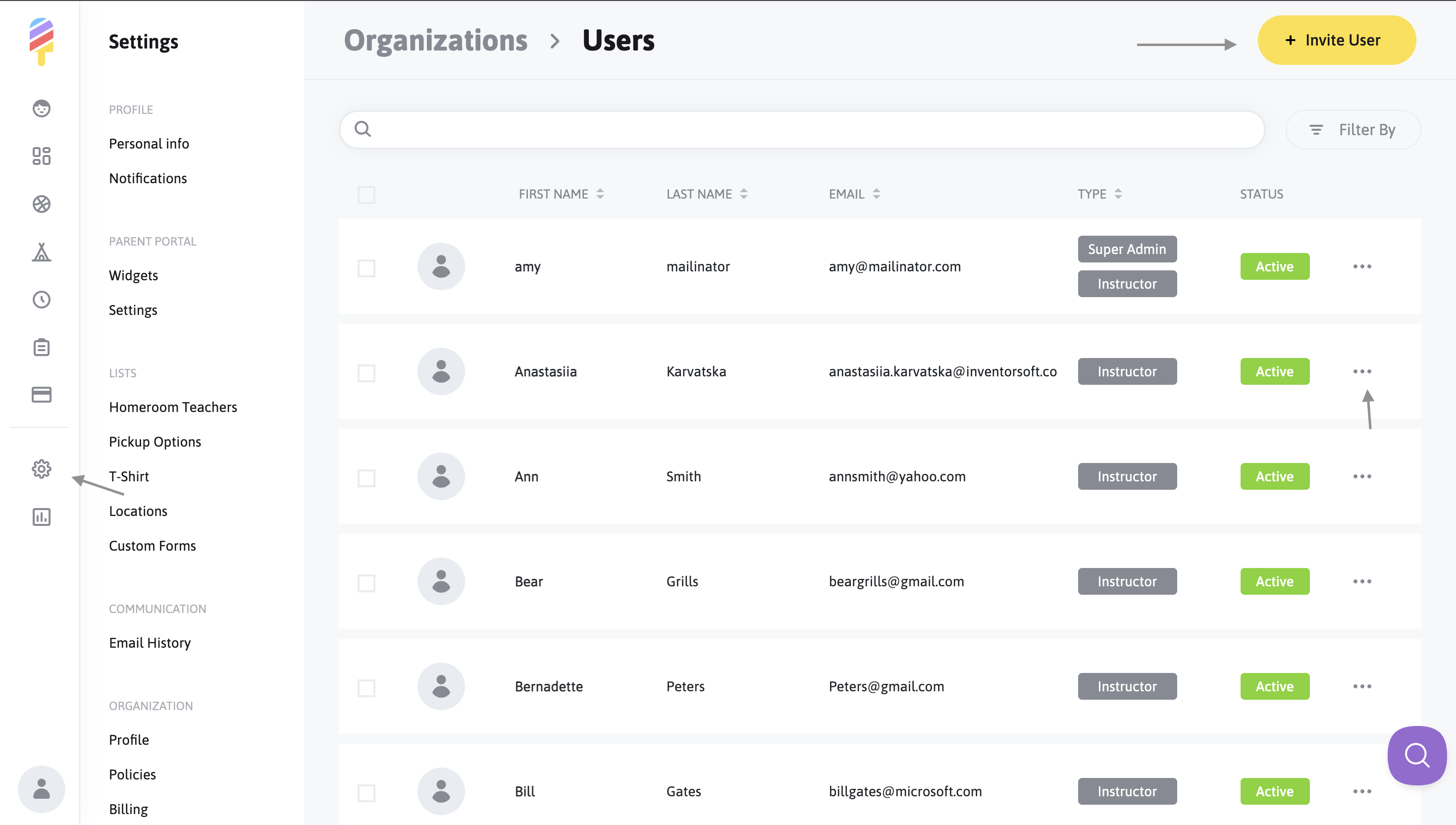 **Please Note: Managers, Coordinators, and Super Admins are also able to have Instructor status, if needed! 🎉 To add Instructor status, click the "Gear Wheel Icon" to enter the Settings, click on Users, and then click on the three dots to the far right of the User that you would like to have Instructor Permissions in addition to their Manager/Coordinator/Super Admin status. In the drop down menu, you will choose the "Make Instructor" option, and you're all set! (This permission can also be removed, if needed, from the same location.)