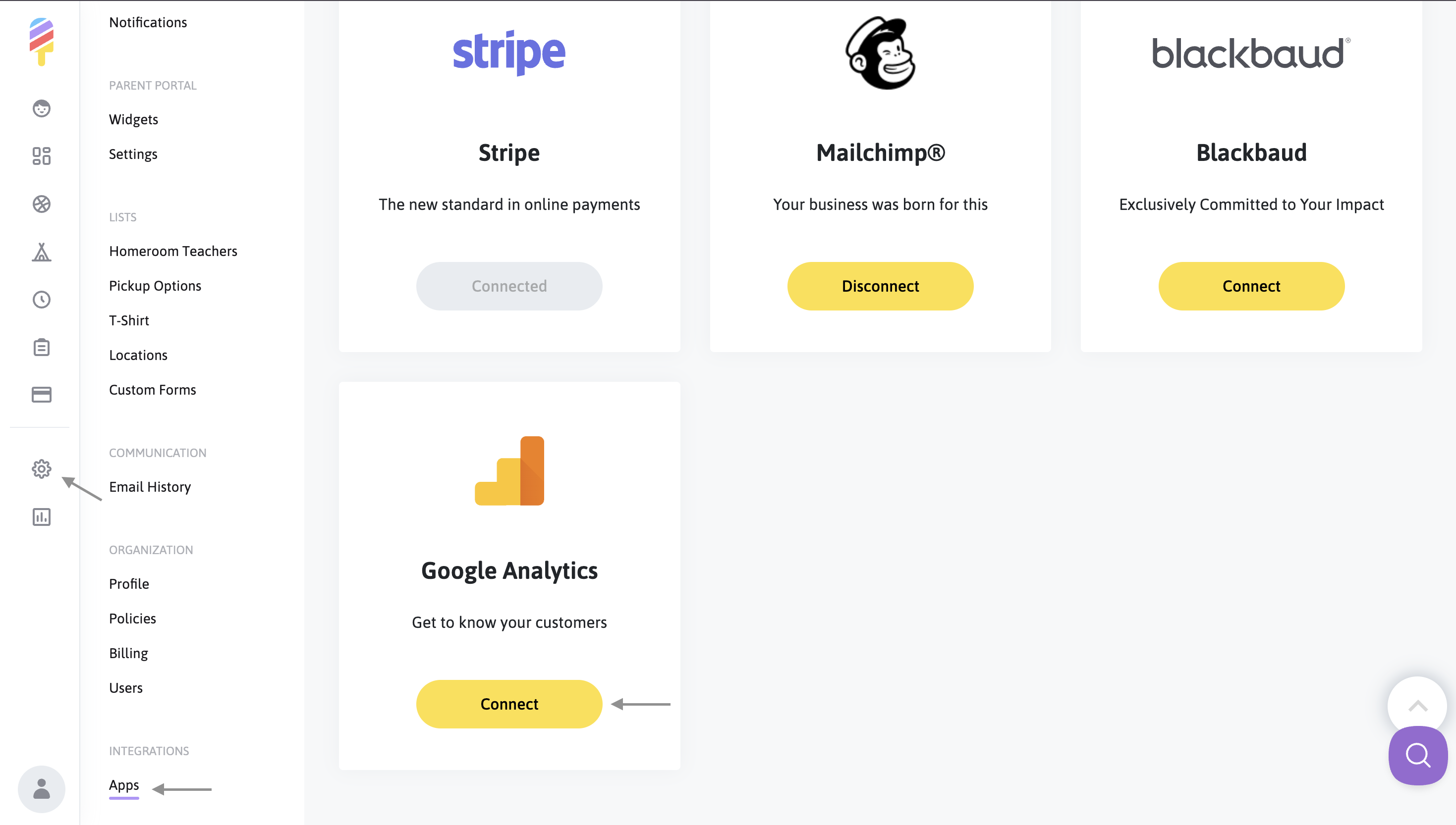 If you would like to integrate your Popsicle account with your Google Analytics account, you can do this very quickly! First, click on the "Gear Wheel" icon along the lefthand side of the screen to enter the Settings. There, under Integrations, click on "Apps." You'll see the option to Connect to Google Analytics:
