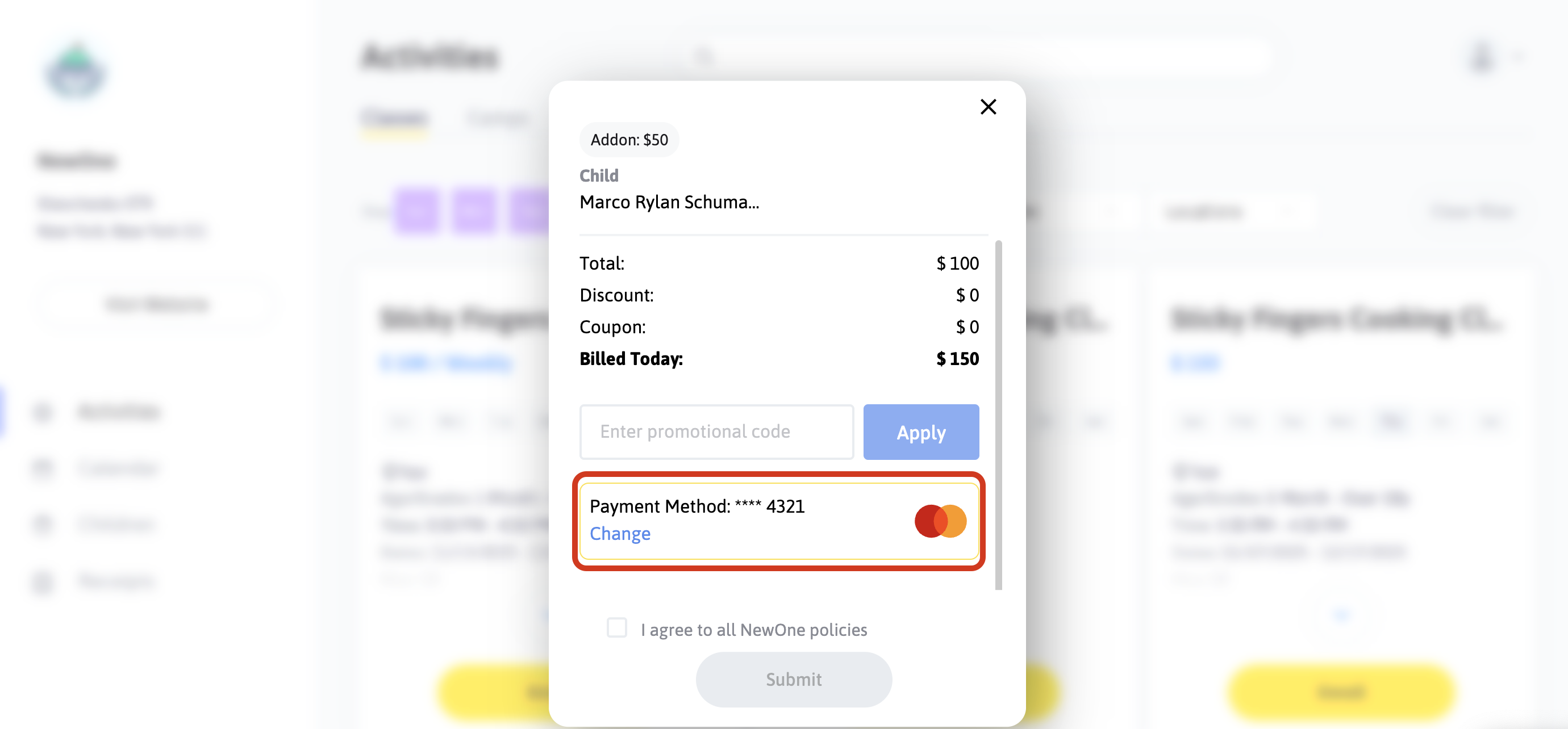 When a parent is registering for an activity, they will be able to use the default payment method they added when they initially created their Popsicle account—or they can choose to add a new/additional payment method to keep on file.