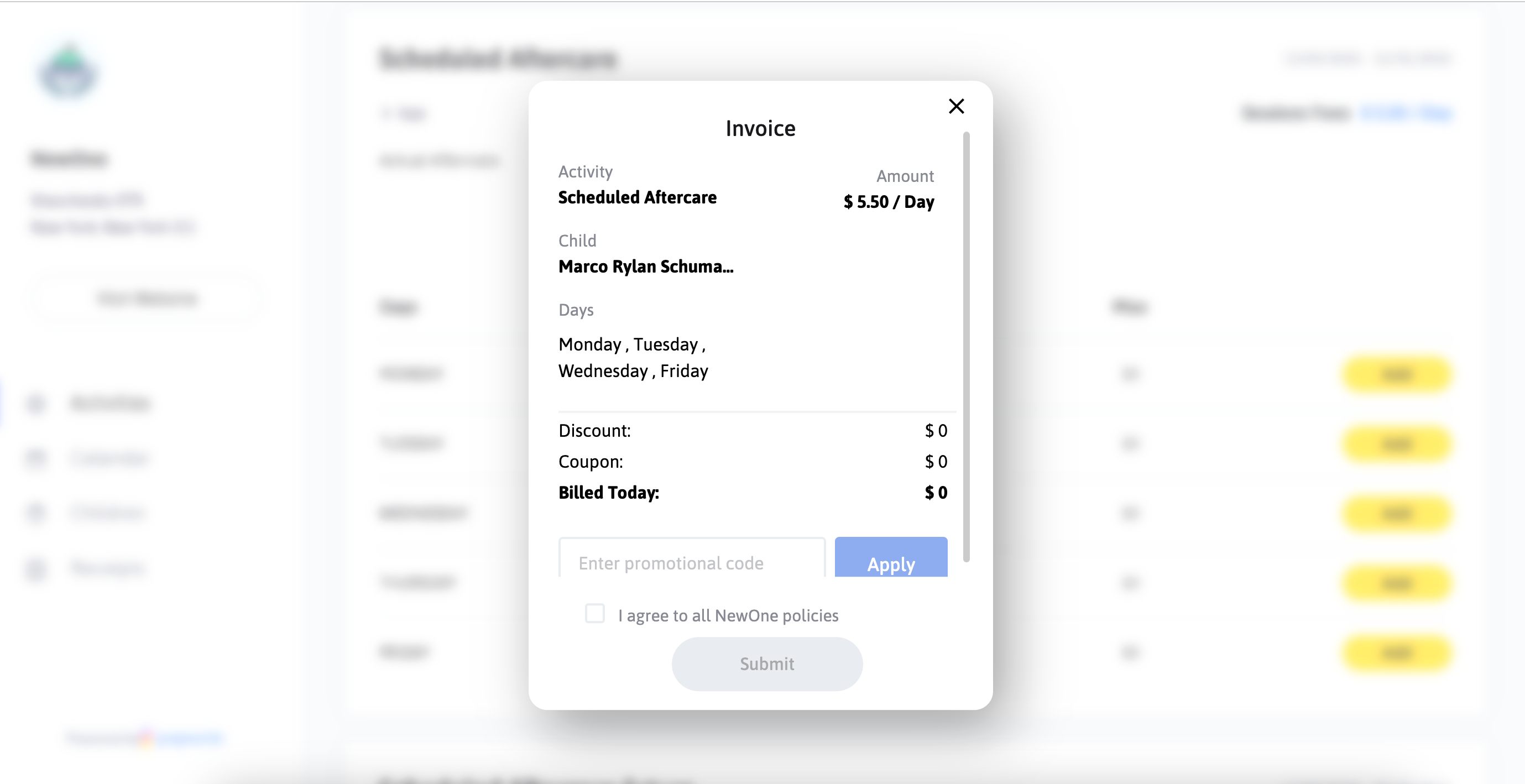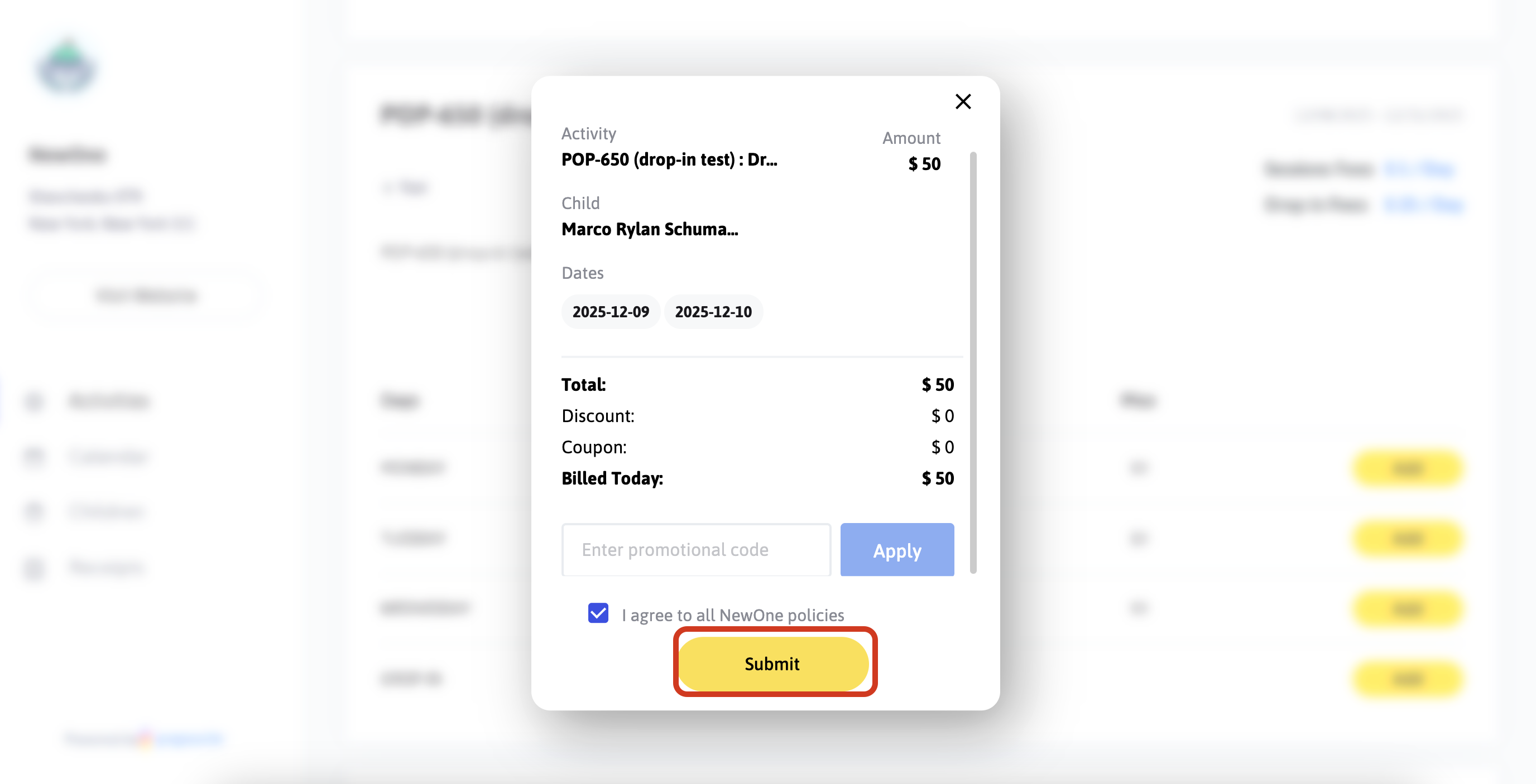To complete registration and pay for your child's drop in classes, click on "Next," and review your activity selections. You will see your child's name, the Drop in days that you've selected, the box for any discount codes you may have, and the option to complete registration by clicking on "Submit":