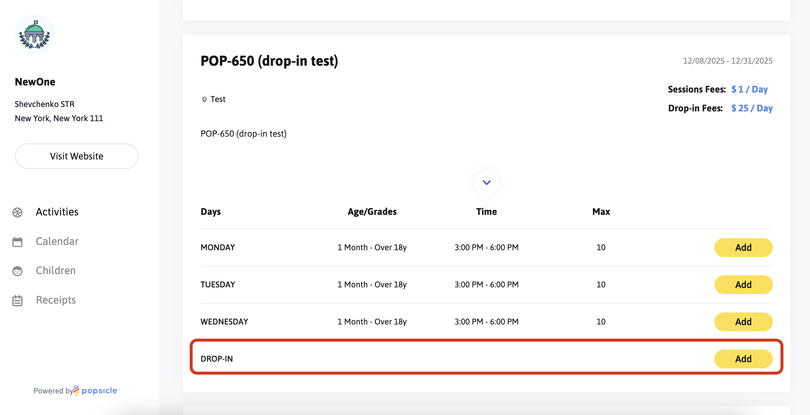 Instead of having to commit to all Mondays for the entire session, or all Tuesdays, etc., you have the option to pick and choose your child's days as needed, by clicking on the "Drop In" option here: