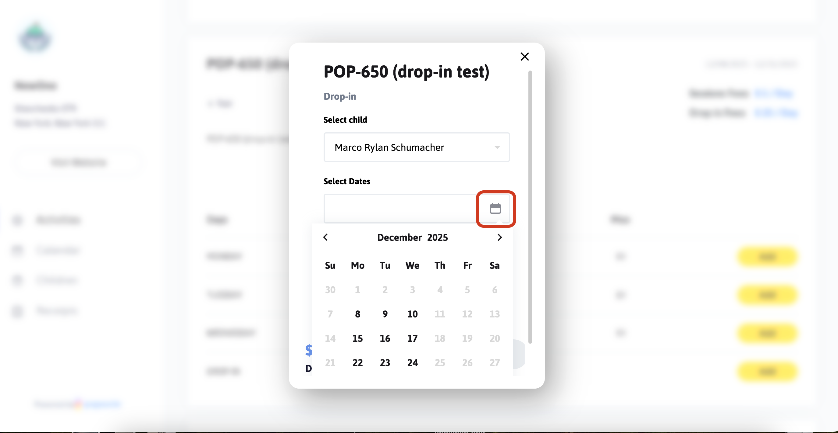 When you click on the "Add" option for Drop In classes, you'll be presented with the option to choose which child you're selecting days for, and a calendar, with all available session days in black font.