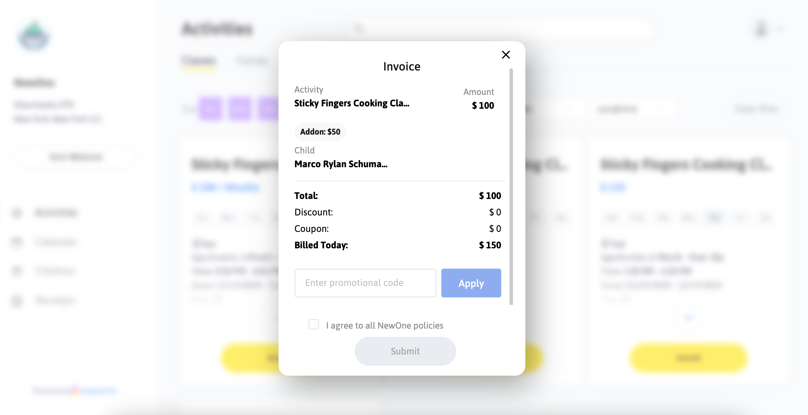 Parents will be able to review the selected activities and extras, and add any coupon codes provided by the school as well: