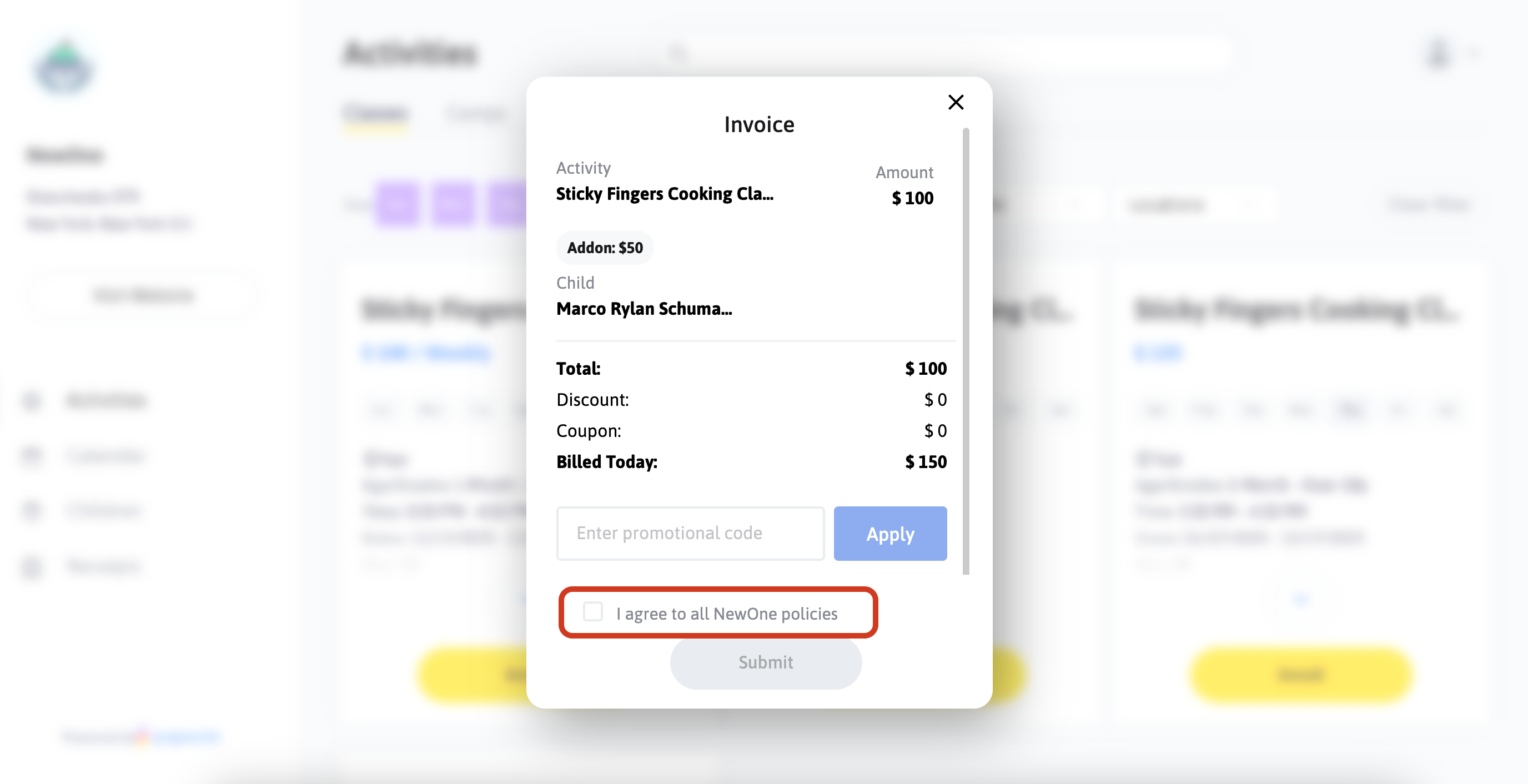 When checking out and paying for the activities, parents must first accept the policies the school has in place, and check the box above the payment option: